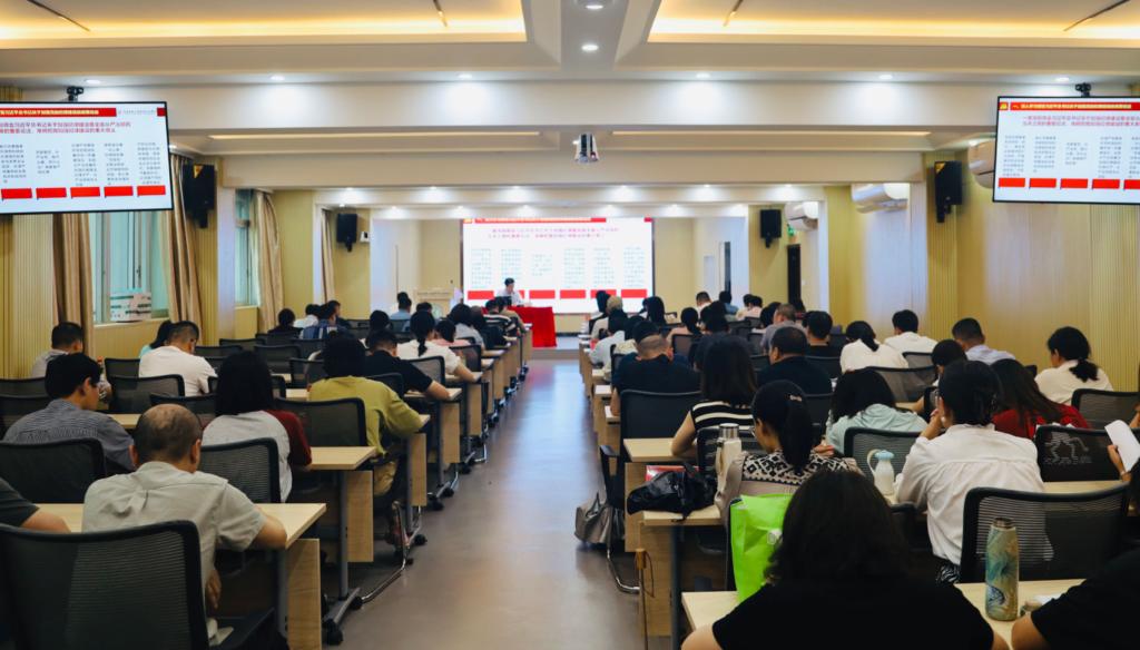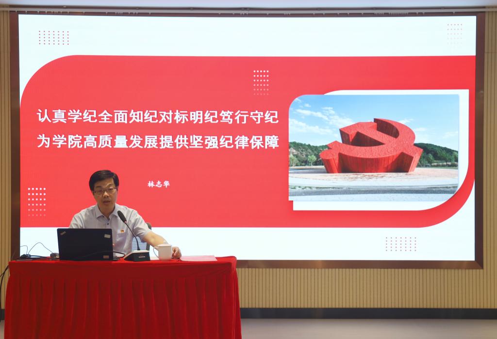 根据校党委党纪学习教育工作部署安排,6月18日下午,校党委书记林志华以《认真学纪全面知纪对标明纪笃行守纪,为学院高质量发展提供坚强纪律保障》为题讲授党纪学习教育专题党课。校党纪学习教育专题读书班成员,校纪委委员,各党总支纪检委员,机关党总支、马院直属党支部全体党员参加,非中共党员处级干部列席。