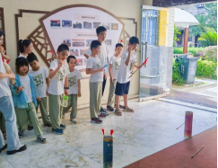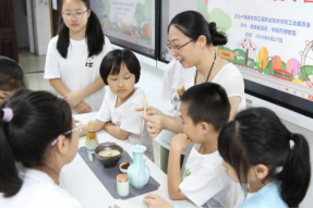 谢琳娜博士带领小营员们体验茶百戏制作,她生动地演示了点茶中调膏、注水、击拂等步骤,还通过对茶叶、茶器的讲解,向小朋友普及我国悠久的茶文化知识。小营员们在动手实践中沉浸式体验宋代点茶文化的韵味。