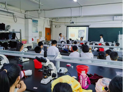 王翠老师带领小营员们使用显微镜观察食品样本中的微生物,教他们观察微生物的模样,了解食品污染和食品安全的微观原因,激发他们对科学的兴趣与热爱。